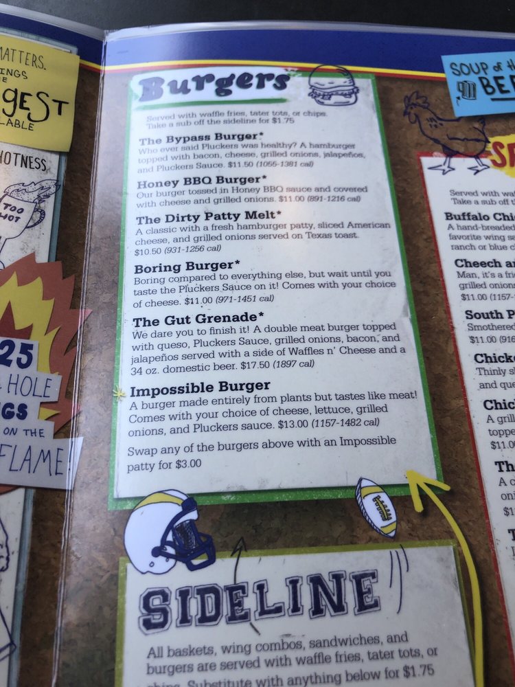 A burger made entirely from plants but tastes like meat! Comes with your choice of cheese, lettuce, grilled onions, and Pluckers sauce.